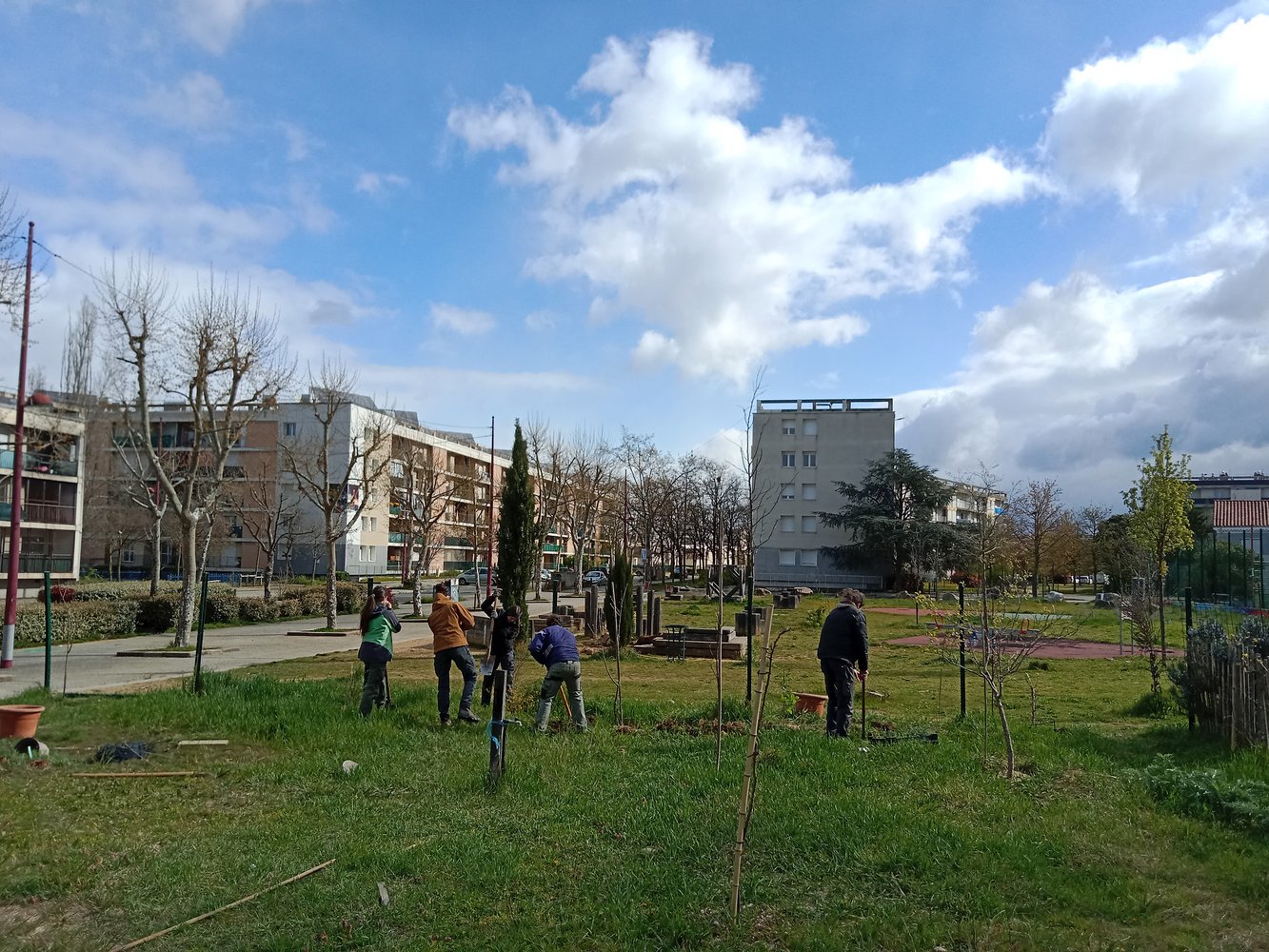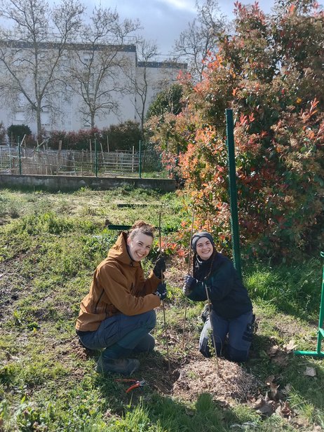 Guidés par notre plan, mais soumis à quelques imprévus, nous avons préparé le sol et procédé aux nombreuses plantations (une soixantaine). Nous avons veillé à bien tuteurer, pailler puis arroser pour assurer la reprise des végétaux. D’ailleurs, nous avons pu constater que les végétaux plantés en décembre étaient en fleurs. En espérant qu’ils porteront bien leurs fruits.