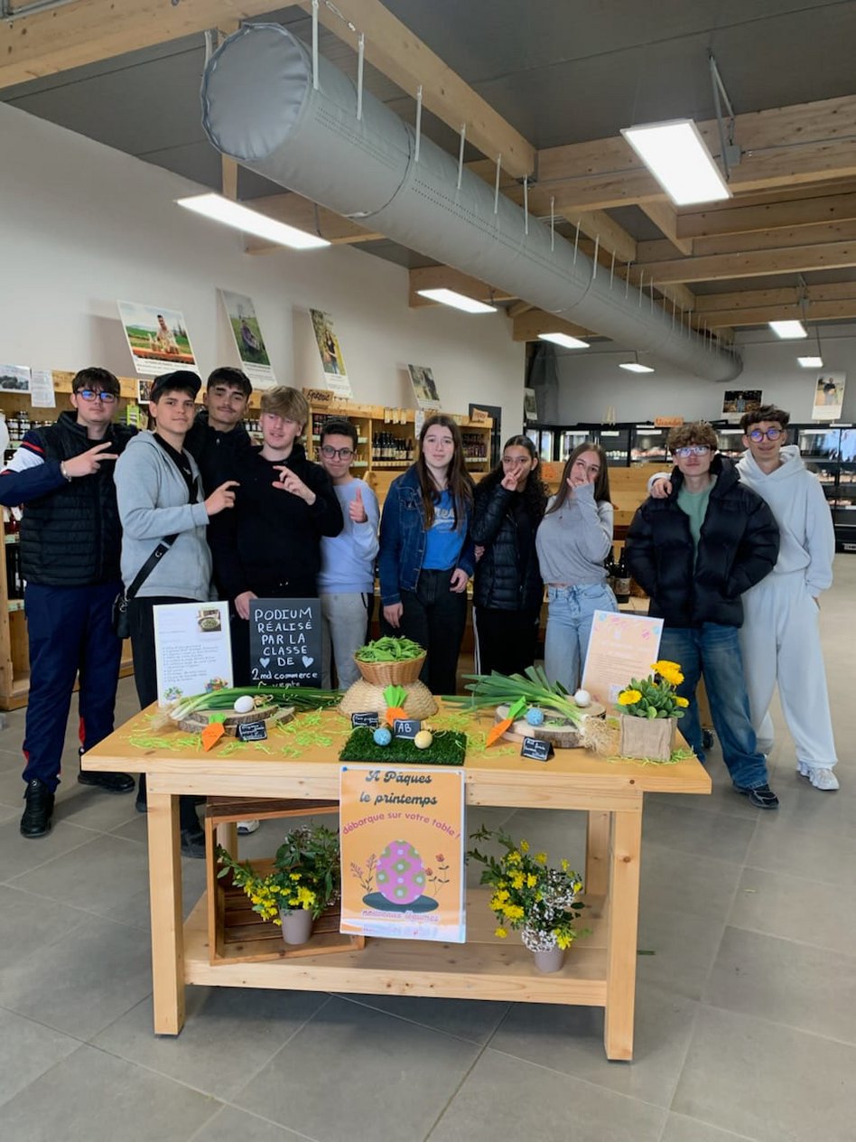 Au-delà de l'aspect visuel, cette opération met en valeur l'engagement du magasin envers les producteurs locaux. Le podium sert de support pour présenter les produits de saison dans un cadre valorisant, rappelant l'importance de consommer local et de soutenir les agriculteurs de la région. L'initiative s'inscrit parfaitement dans la démarche pédagogique de Terre d'horizon, qui forme les futurs professionnels du commerce à travers des actions réelles et ancrées dans leur territoire.